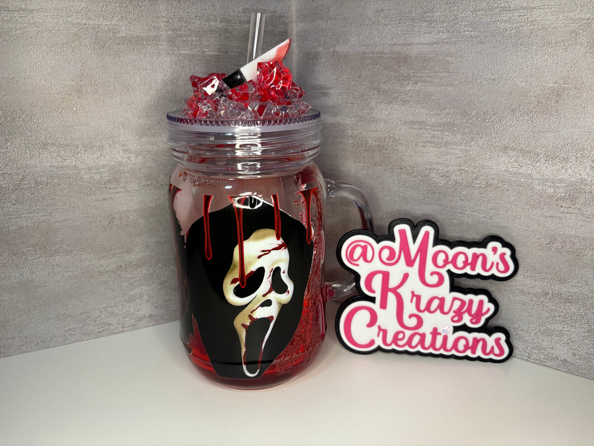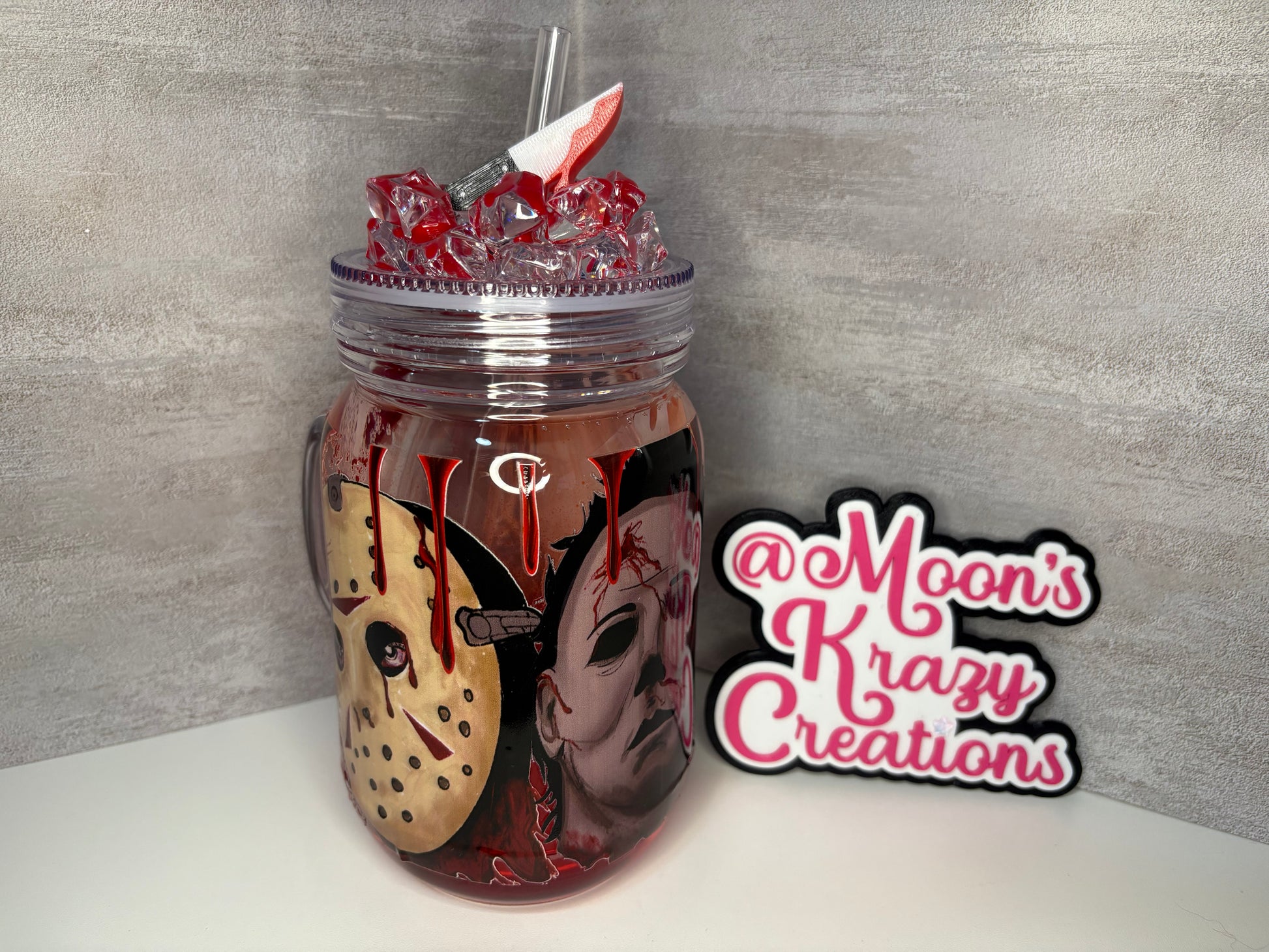 Fall guys plastic lava tumbler with a fake ice blood drip lid with a knife straw topper