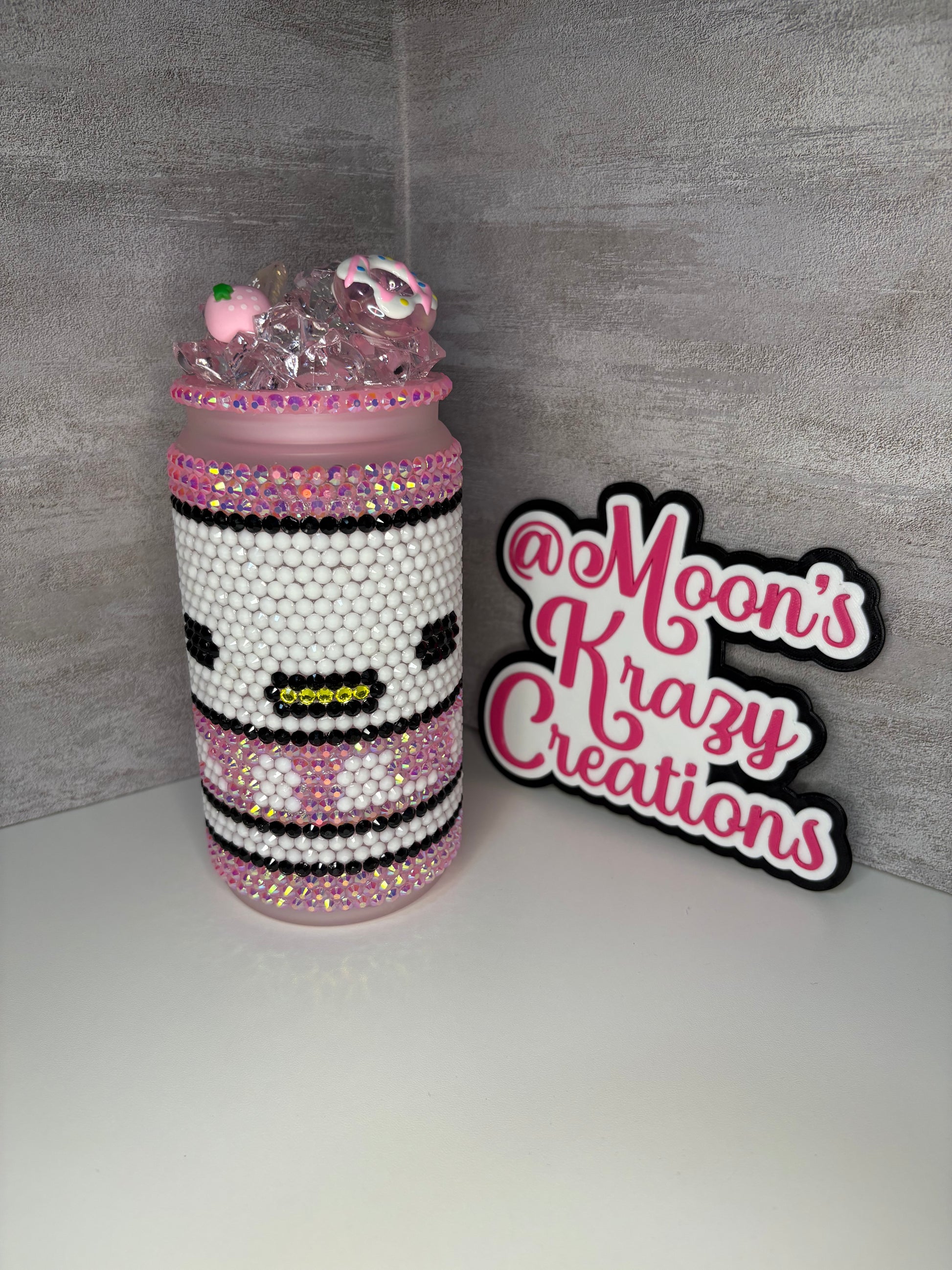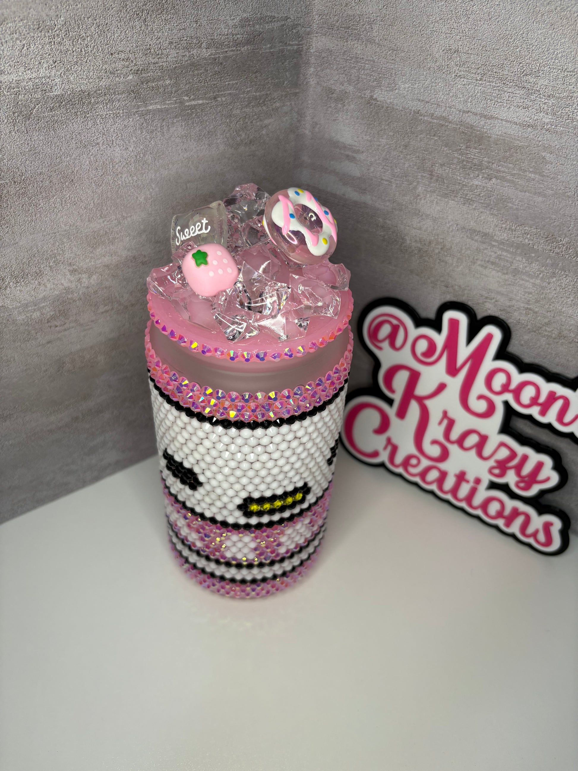 This is a handmade glass rhinestone tumbler with a fake ice lid