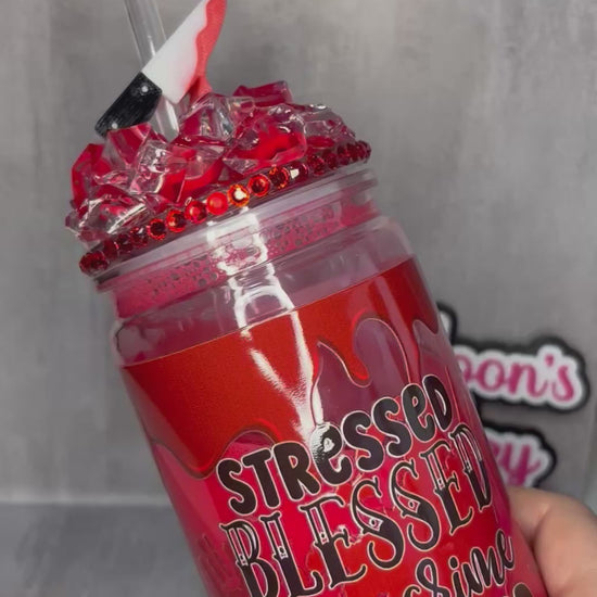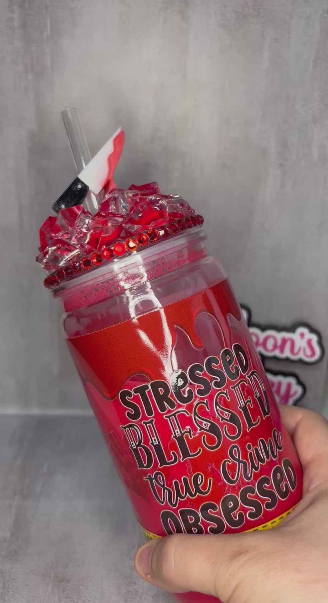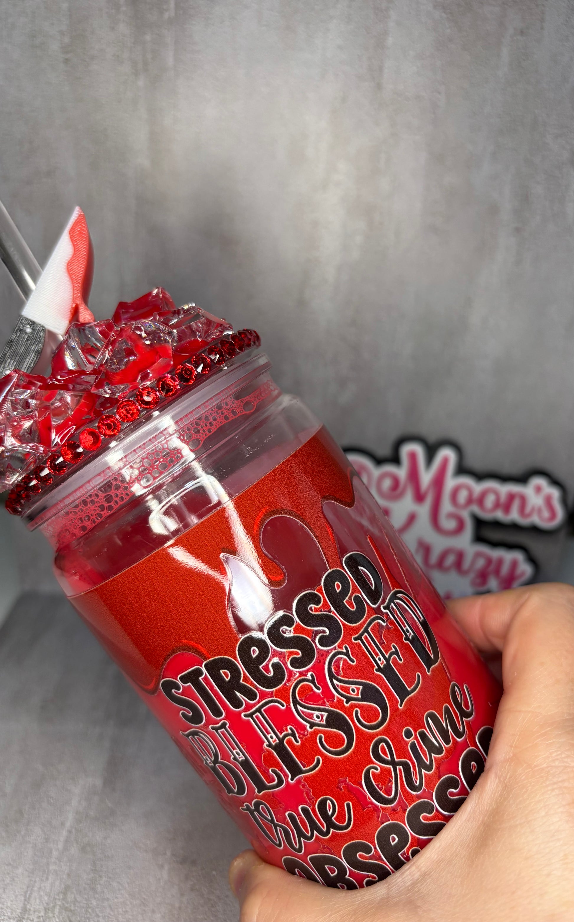 For them true crime fans!!! Plastic red filled tumbler with a fake ice blood drip lid and a knife straw topper!!!!
